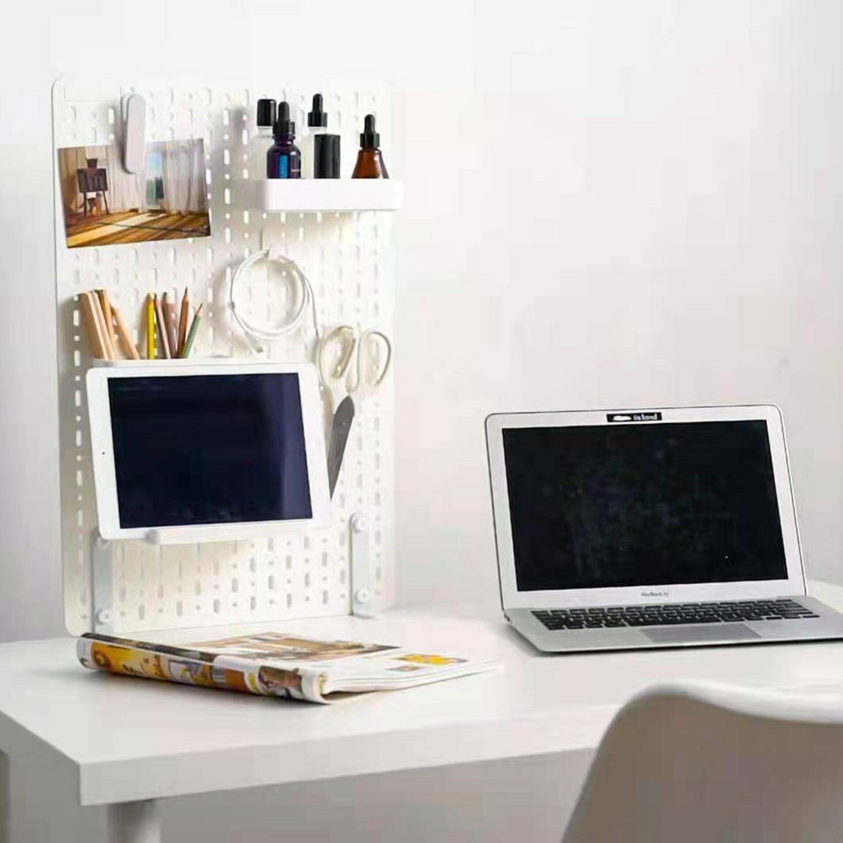有孔ボード 卓上収納 ホワイト【清潔感・お洒落装飾6点セット】自宅 事務所 オフィス机 デスク 食卓 勉強机 リビング 壁掛け 取付簡単 工具不要 耐荷重20kg インテリア収納560x360x5mm ペグボード パンチングボード 机 おしゃれ収納 小物パーツ付き | 橘品女子CitrusGrace