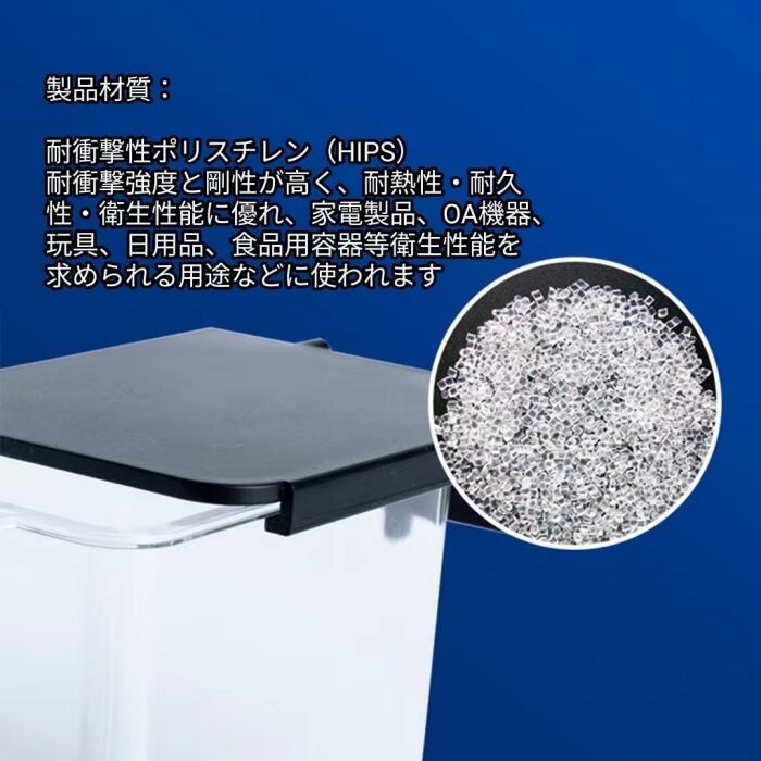 ■材質: 耐衝撃性ポリスチレン(High Impact Polystyrene)、耐衝撃強度と剛性が高く、耐熱性・耐久性・衛生殺菌性能に優れ、腐食性または有毒ガス発生せず、家電製品、OA機器、玩具、日用品、食品用容器等衛生性能を求められる用途などに使われます。