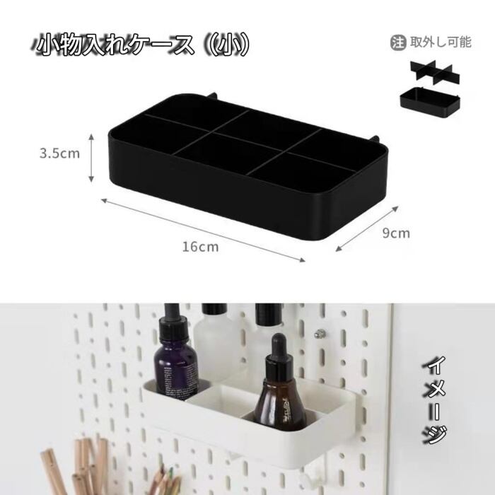 時計や鍵など、吊り下げて収納したい場合はL字フック、不定形の小物の収納や、カードなどの収納にはミニコンテナなど、好きな場所に好きなように収納パーツを取りつけてください。