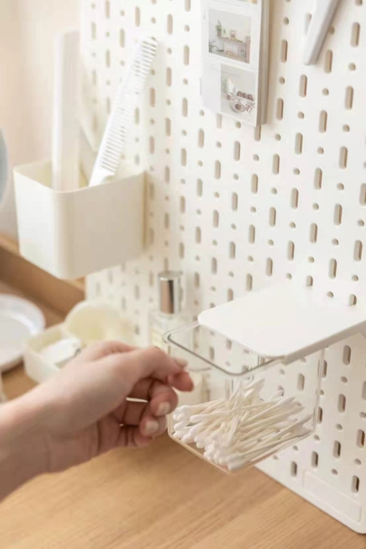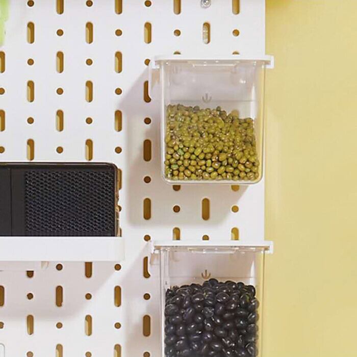 収納したい物や数に応じて、付属のL字フックや透明ボックス、小物収納ケース、ミニコンテナなどを取りつけてカスタマイズできます。